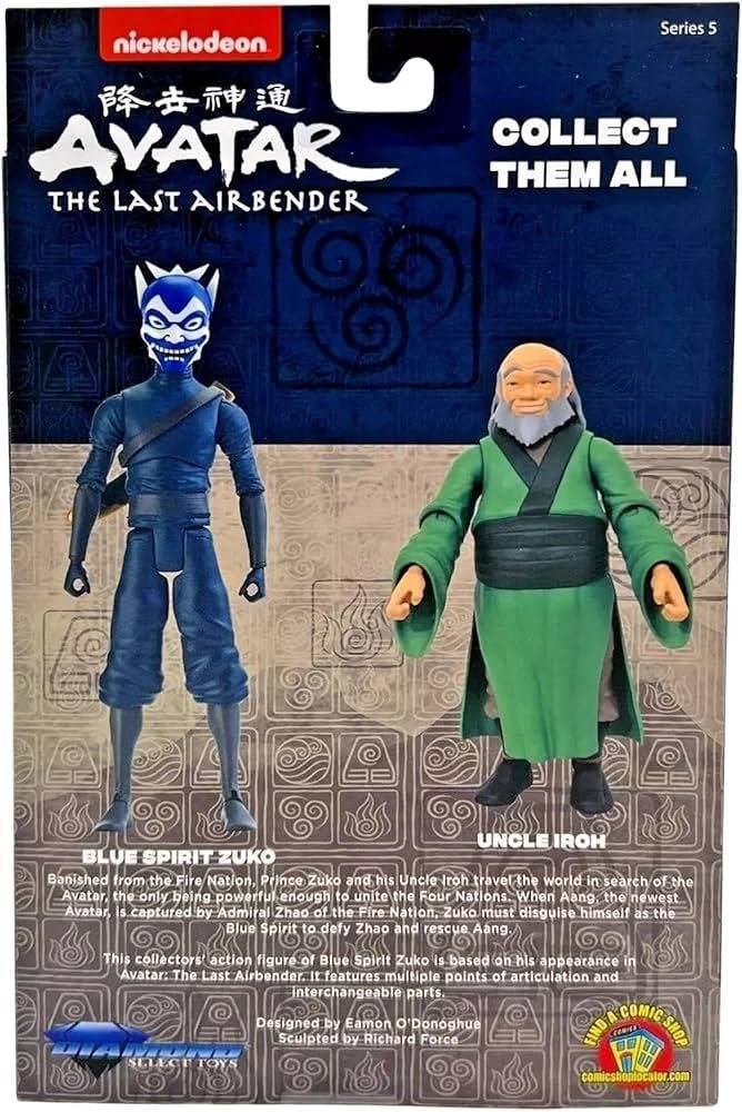 Colecciona el príncipe Zuko en su traje ninja “Blue Spirit” con máscara extraíble y el tío Iroh en sus batas de la nación terrestre