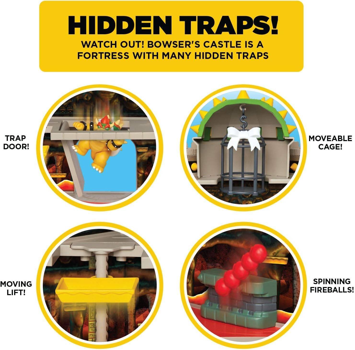 Explora el castillo interactivo de Bowser, pero ten cuidado con las trampas ocultas, como las bolas de fuego giratorias, la jaula que se abre, el ascensor móvil y la trampilla