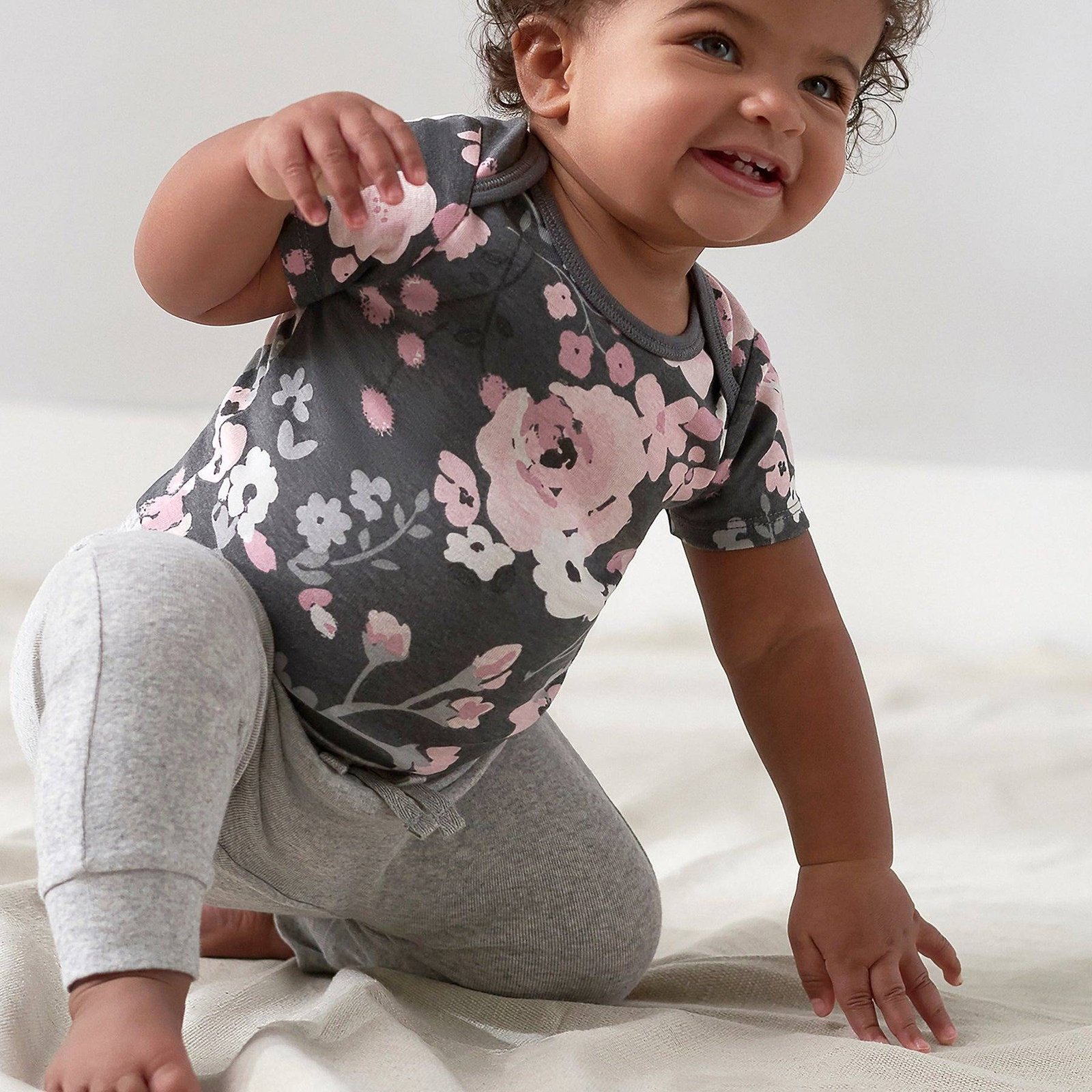 Nuestros pantalones jogger son perfectos para mezclar y combinar con sus monos, camisetas y tops favoritos. Cada par de pantalones para bebé niño está confeccionado con tela de algodón súper suave mezclada con un toque de spandex. Nuestros artículos básicos han sido certificados de forma independiente con STANDARD 100 by OEKO-TEX® para que no tengas que preocuparte por las sustancias nocivas en el guardarropa de tu bebé. Este juego incluye 4 joggers para bebé niña con estampados de color gris liso, rayas, flores y lunares.