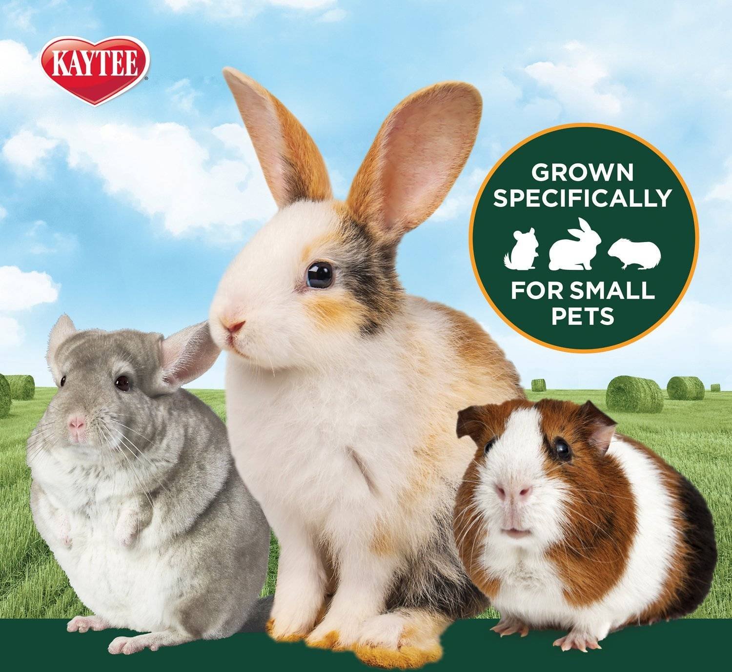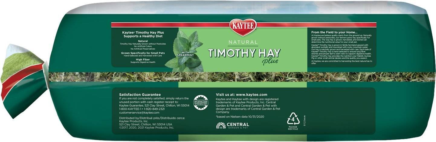 Dele a su mascota los beneficios del heno timothy rico en fibra y la menta relajante con Kaytee Timothy Hay Plus Mint Small Animal Food. Las mascotas pequeñas, como los conejillos de Indias, los conejos y las chinchillas, necesitan heno para ayudar en el proceso de digestión, mantener sus dientes cortados y satisfacer su necesidad de masticar. De hecho, el heno debería constituir el 75 por ciento de su dieta diaria. El alimento para animales pequeños Kaytee Timothy Hay Plus Mint es natural, no contiene químicos y está hecho simplemente con solo heno de timothy curado al sol y menta seca, una ayuda digestiva natural. Ofrézcalo varias veces al día como regalo además de su suministro regular de heno.